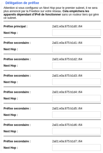 Pour le cas où ce ne serait pas suffisant pour assouvir nos besoins, il y a 6 autres préfixes /64 secondaires, ce qui nous ferait au total 7 x 264 adresses publiques à notre disposition. Mais pour les mériter, il va falloir travailler un peu.